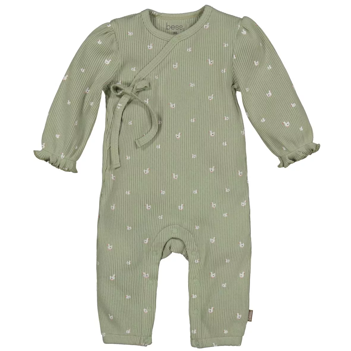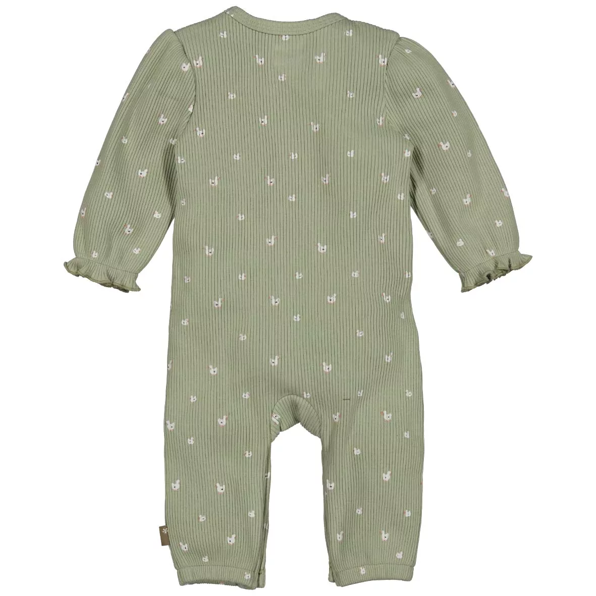 Grenouillère de couleur vert sauge imprimé de petites oies est la tenue pratique et confortable pour bébé.