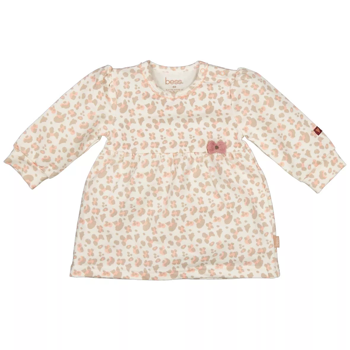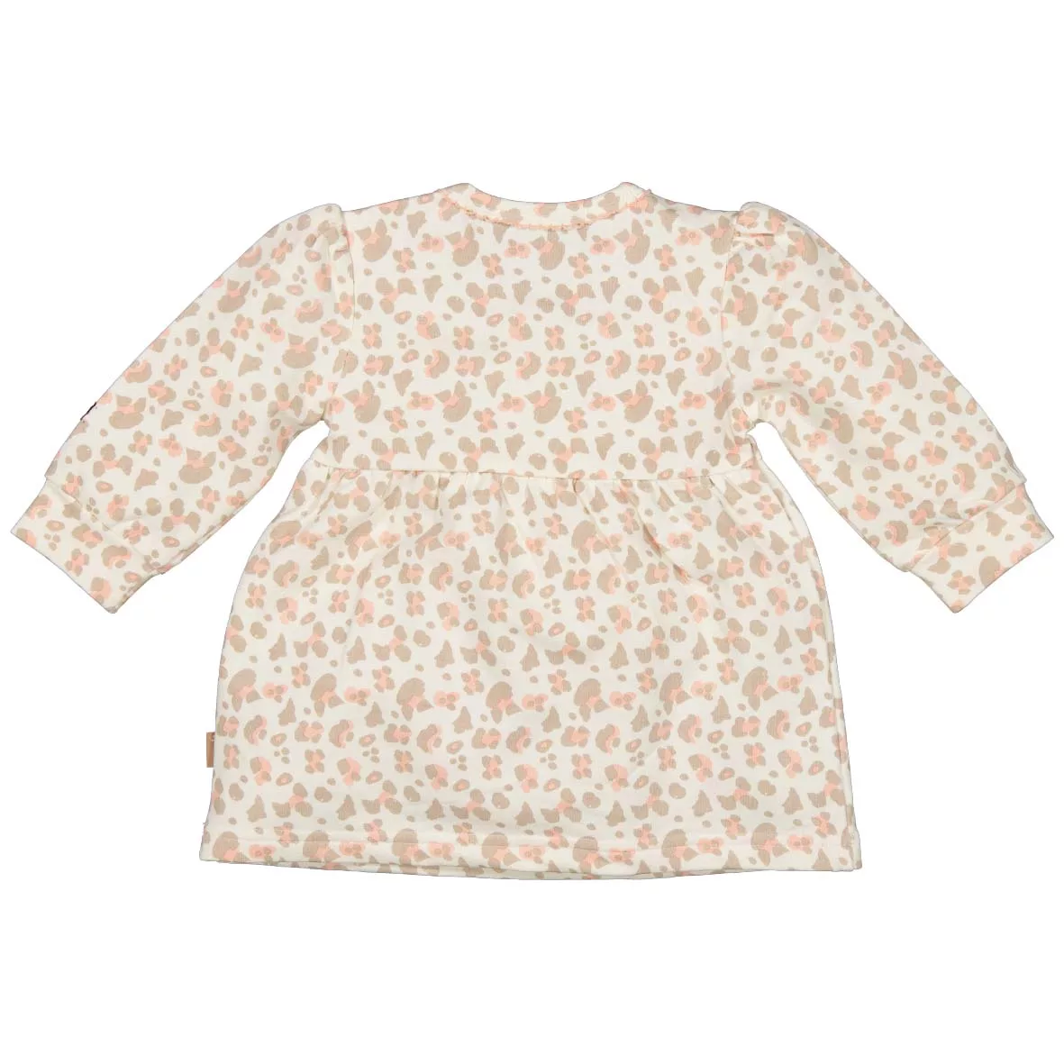 Robe écrue imprimé léopard rose et taupe agrémenté d’un petit noeud au niveau de la taille et pourvue de deux pressions à l’épaule pour faciliter l’enfilage .