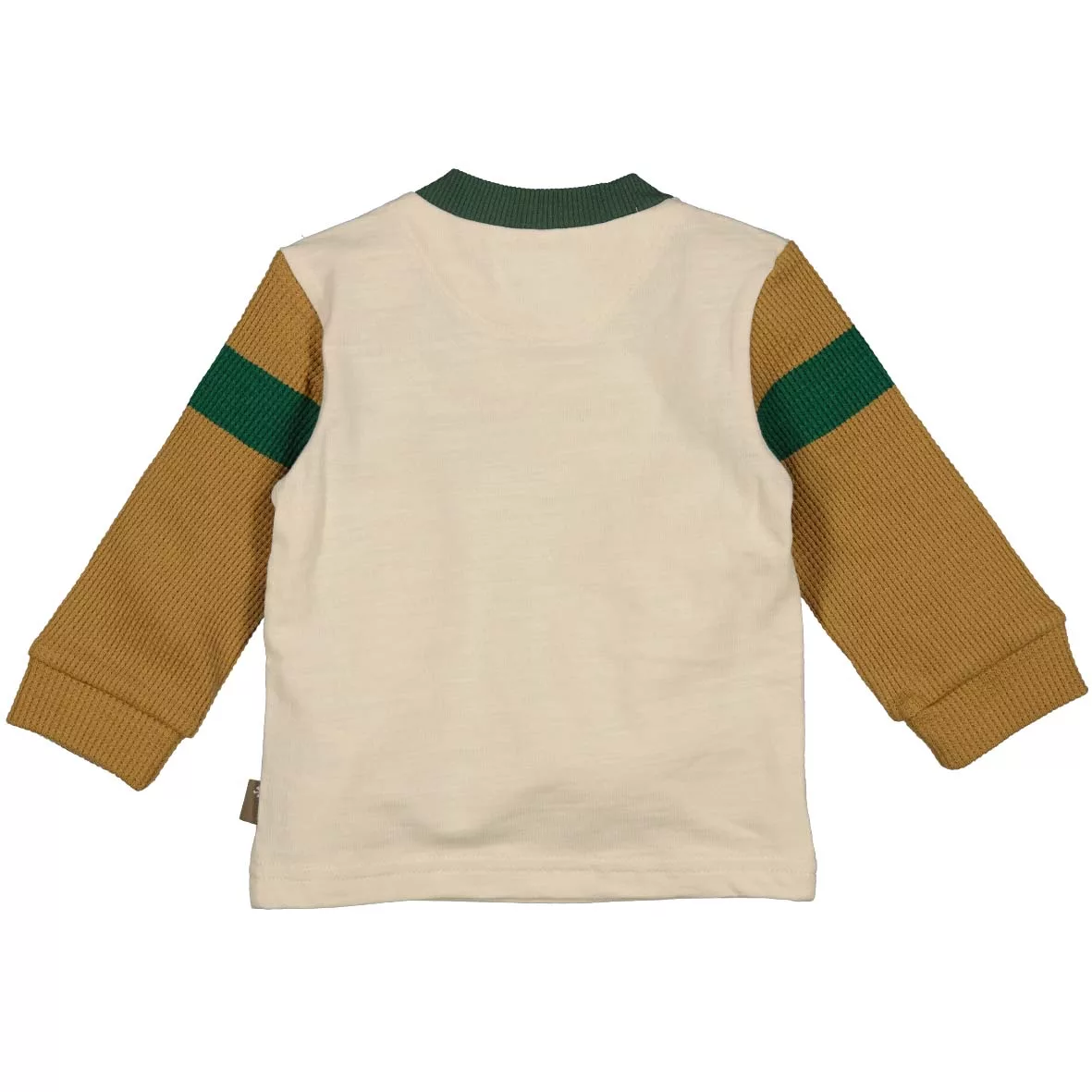 De couleur blanc cassé avec manches gaufrée dans les tons brun clair rayé vert fait l’originalité de ce t-shirt. Joli basique à avoir dans le dressing de bébé car s’associe avec tout